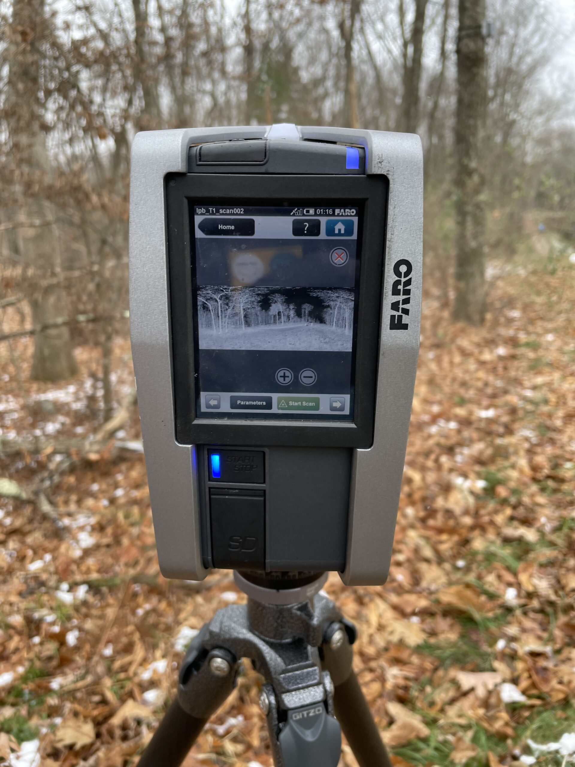 Figures 7,8, and 9 left to right: (7) Scanning equipment for characterizing forest edge includes a terrestrial laser scanner (TLS) seen here (FARO Focus 3D), but also a drone-borne scanner (UAV-LiDAR) (DJI Enterprise Matrice 300 Series); (8) Open-source Arduino-based inclinometer high on a tree, in a weather-proof box for tracking sway motion; (9) battery and data storage box for Arduino-based inclinometer on tree trunk.